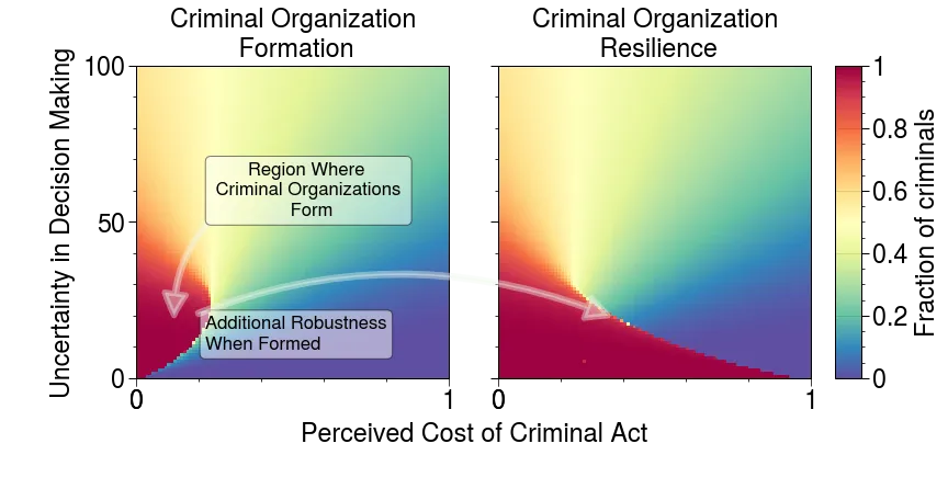 Figure 2. Criminal organizations gain strong resilience after being formed. Simulations were performed starting from two distinct scenarios. The first scenario (left) describes the situation in which the simulation starts without any criminals. When the perceived cost of a criminal act is low, criminal organizations spontaneously emerge as the perceived cost approaches zero. This effect becomes more pronounced as actors have incomplete information about their surroundings. With mild to moderate amounts of decision error criminal emergence. In the second scenario (right), the simulation starts with all agents as criminals. A wide tail can be observed where for increasing perceived cost, criminal organizations remain active. This increased resilience shows that criminal organizations gain resilience after being formed; when a criminal organization spontaneously forms in society (left) it “moves” into a regime in which further interventions does not yield the same result (right).