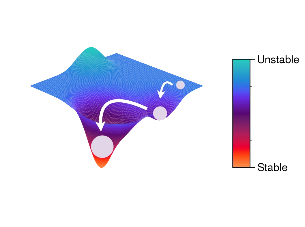 Figure 1. The resilience and adaptivity of criminal organizations can be likened to a marble moving over a surface. Some places are unstable where small nudges will move the marble down – akin to being on top of a hill. Stable areas are indicated by deeper troughs, making them harder to dislodge. When the criminal organization grows –akin to having a larger marble – it will be harder and harder to dislodge criminal organizations within deeper valleys. Perceived cost of the criminal act will dictate the shape of the landscape, creating pockets of criminality or making them disappear.